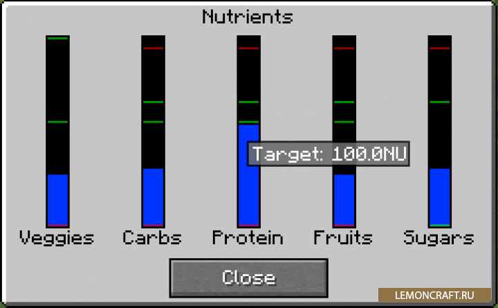 Мод на диету Nutritional Balance внесет изменения в систему питания вашего персонажа, предлагая вам питаться в сбалансированном режиме. Соблюдая все предписания вы станете сильнее и быстрее, а если будете питаться абы чем, ослабеете. Нажав кнопку N вы сможете посмотреть в специальном интерфейсе, вам нужно удерживать все показатели (овощи, углеводы, белки, фрукты и сахар) на зеленом уровне.